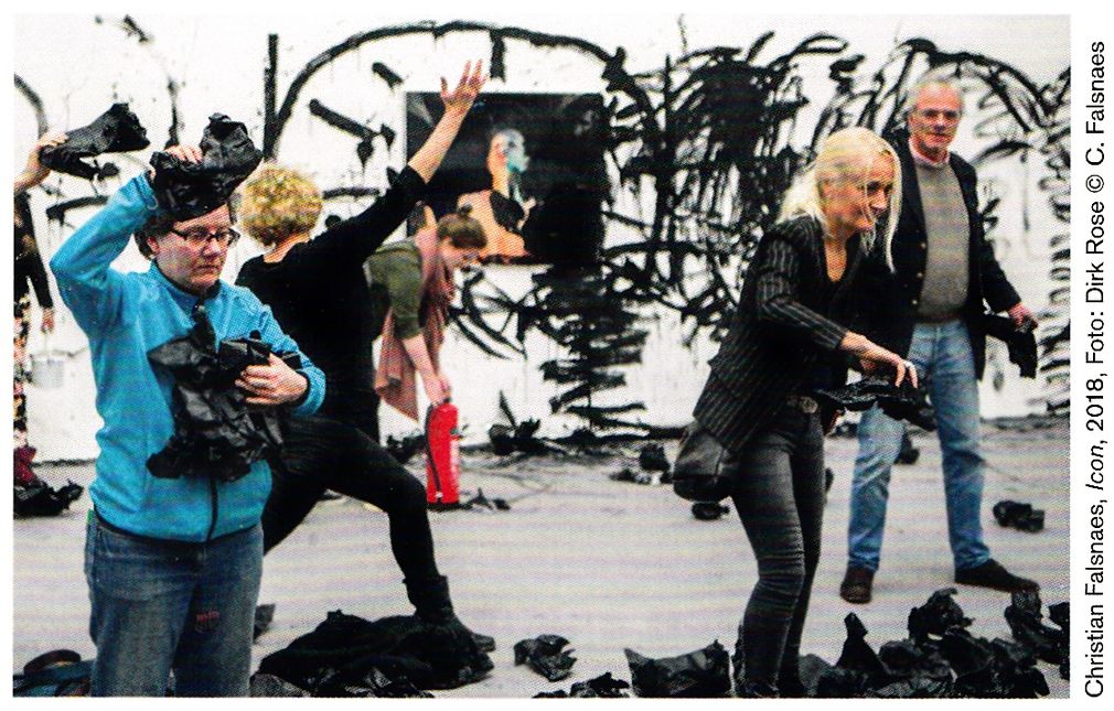 Die laufende Ausstellung von Christian Falsnaes konfrontiert das Publikum mit Installationen, mit Relikten von, aber auch Bühnen, Utensilien und Anweisungen für Performances – als deren Akteure vor allem die Besucher_innen selbst firmieren. Aufführung bzw. lebendige Aktion einerseits und Arretiertes, installativ Hergerichtetes sowie Bildliches andererseits gehen mannigfache Beziehungen ein. Das bietet Anlass, sich zunächst auch auf ältere Verhältnisse von Performance und Bild zu besinnen. Denn deren Nachwirkungen betreffen die derzeit partizipativen Tendenzen in der Performance Art; sie betreffen desweiteren jene digitale Kultur, deren Einfluss auf Performance Art heute die Diskussionen vergleichbar umtreibt wie einst die Rolle von Fotografie und Video innerhalb aufführender Praktiken.