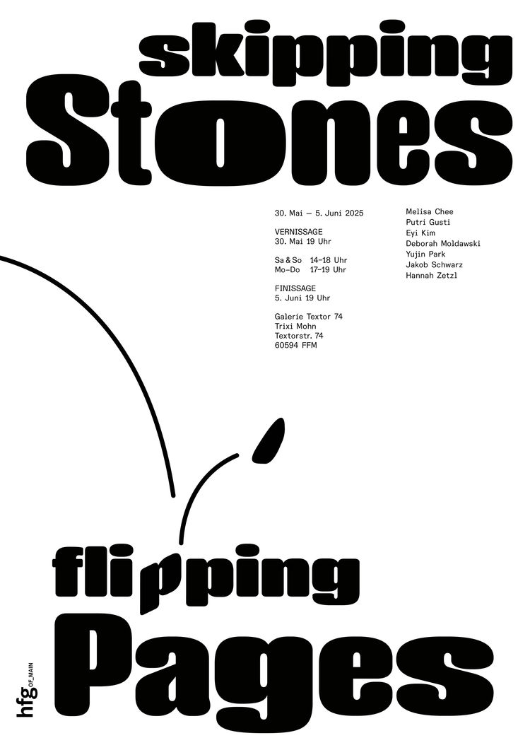 Die Ausstellung »Skipping Stones, Flipping Pages« zeigt buchkünstlerische Arbeiten, die im Wintersemester 2024/25 unter der Leitung von Hyewon Jang in der Buchwerkstatt der HfG Offenbach entstanden sind. Die Buchobjekte zeigen individuelle künstlerische Zugänge zum Thema Stein.