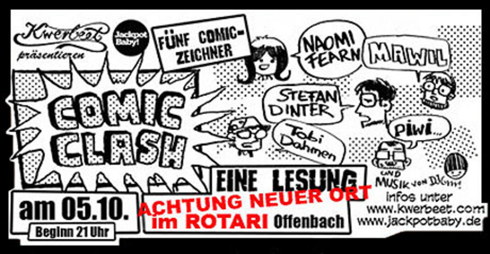 Präsentiert wird »Comic Clash« vom Illustratorenkollektiv Kwerbeet und dem Internet-Blog-Magazin Jackpot Baby!. Musik von Dj Grrr!.
