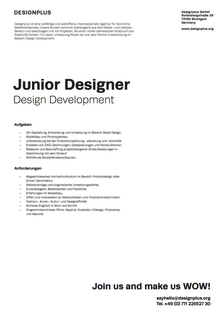 Designplus ist eine vielfältige und weltoffene, interdisziplinäre Agentur für räumliche Markenerlebnisse. Unsere Kunden kommen überwiegend aus dem Mode- und Lifestyle- Bereich und beauftragen uns mit Projekten, die einen hohen ästhetischen Anspruch und Kreativität fordern. Für deren Umsetzung freuen wir uns über frische Unterstützung im Bereich Design Development.