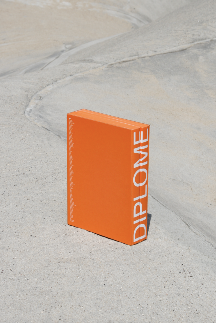 In seiner Struktur und Funktionsweise hinterfragt der Katalog die Regeln der Buchgestaltung und spielt mit deren Grundsätzen. Der Katalog ist in ein sattes Orange getaucht, das sich gleichermaßen über alle Seiten und auch über die Schnittkanten zieht: Eine monochrome Leinwand für die Liste von 82 Namen, die den Block vom Rücken aus umgreift und deren Ausläufer die Buchdeckel zieren. Die Namen der Absolvent_innen der Hochschule sind die Wirbelsäule des Katalogs und geben schon von außen einen Hinweis auf dessen Struktur.
