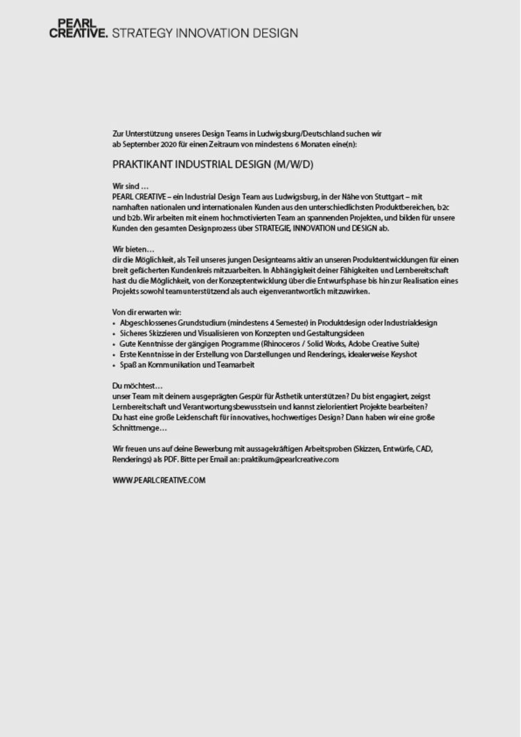 Wir freuen uns auf deine Bewerbung mit aussagekräftigen Arbeitsproben (Skizzen, Entwürfe, CAD, Renderings) als PDF. Bitte per Email an: praktikum@pearlcreative.com