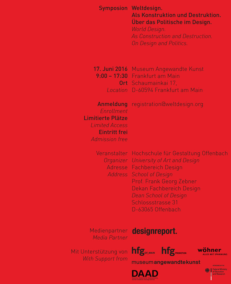 Am 17. Juni 2016 findet im Museum Angewandte Kunst in Frankfurt das Symposium »Weltdesign. Als Konstruktion und Destruktion. Über das Politische im Design« des Fachbereichs Design der Hochschule für Gestaltung Offenbach statt. Es ist nach 2014 die zweite Auflage der internationalen HfG-Designkonferenz »re/set«.