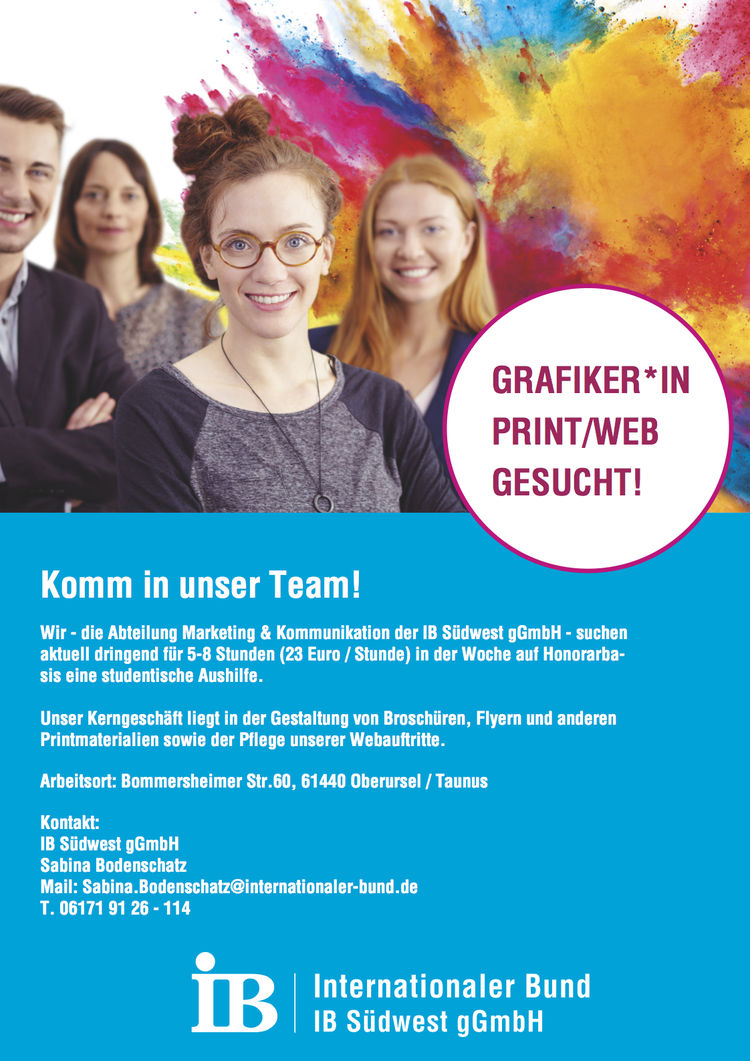Wir – die Abteilung Marketing & Kommunikation der IB Südwest gGmbH – suchen aktuell dringend für 5-8 Stunden (23 Euro / Stunde) in der Woche auf Honorarbasis eine studentische Aushilfe.