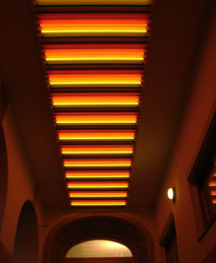 An die Decke über den Treppenaufstieg im Haupteingang ist nun eine Reihe aus 80 parallel angeordneten 1,5 Meter langen Leuchtstofflampen montiert. Jede Leuchtstoffröhre ist mit einem Schutzrohr versehen, in dem sich in wiederholender Reihenfolge jeweils eine rote, blaue, grüne, gelbe oder uneingefärbte Folie befindet. Zusätzlich ist jede Röhre in ihrer Helligkeit stufenlos regelbar.